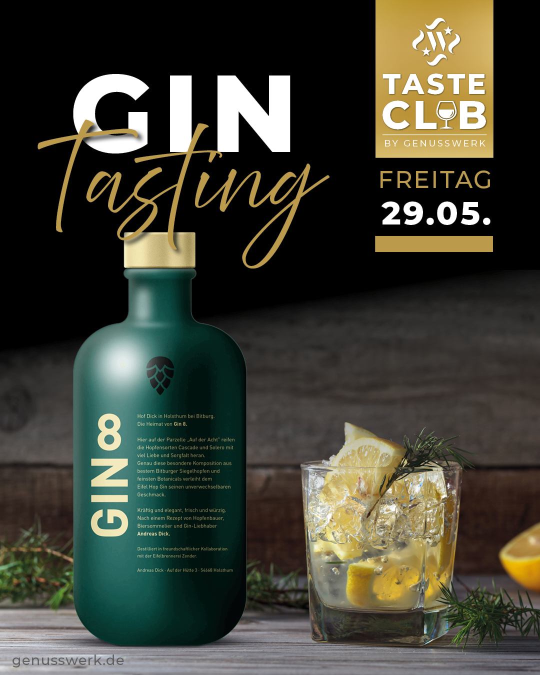 Ein Abend für alle, die guten Gin lieben. Gemeinsam mit GIN8 und Andreas Dick laden wir dich zu einem besonderen Tasting ein. Freue dich auf ausgewählte Gins, spannende Geschichten rund um Botanicals, Herstellung und Aromen sowie auf neue Geschmackserlebnisse im Glas. Mehr Infos zum Hopfen-in aus der Eifel unter www.gin-8.de.