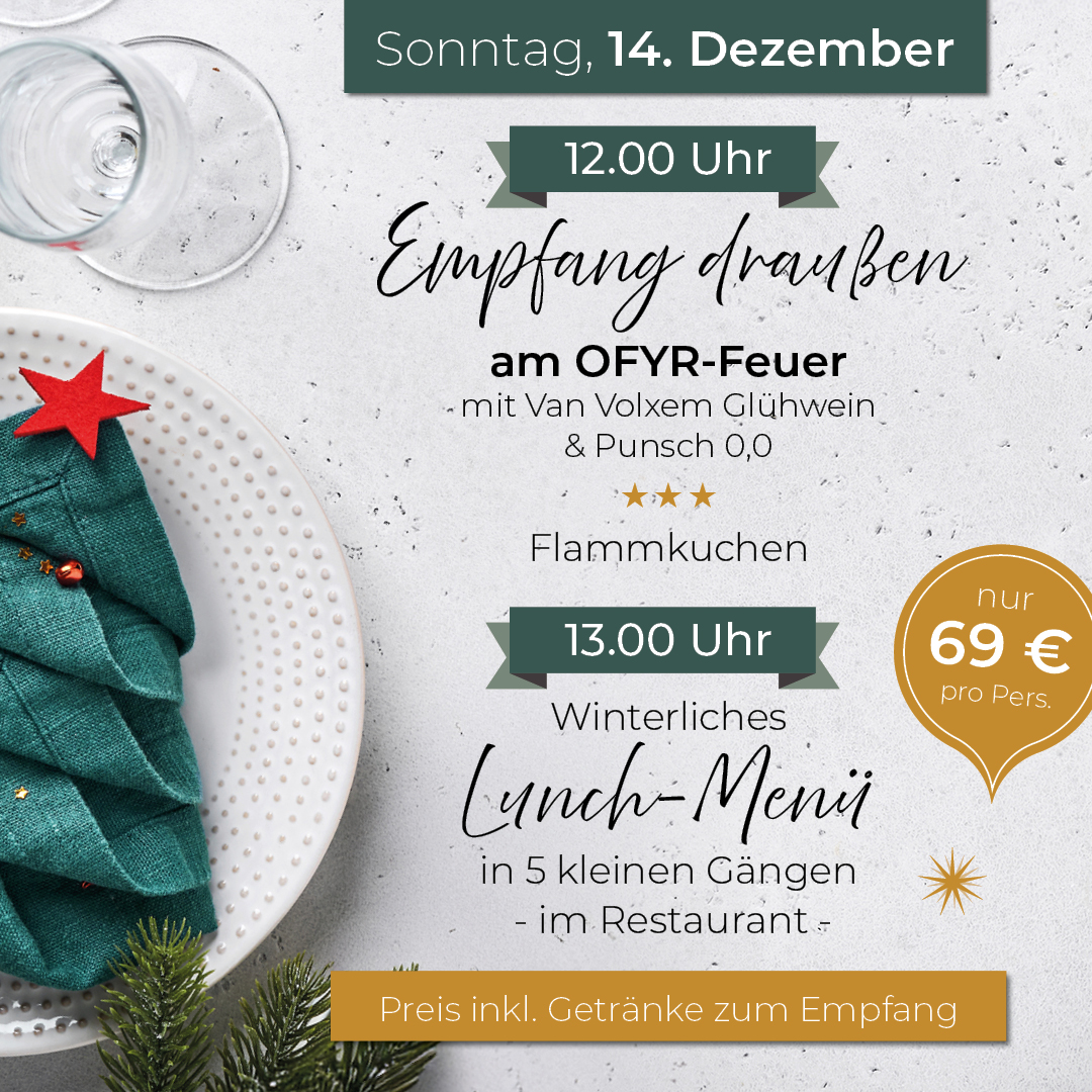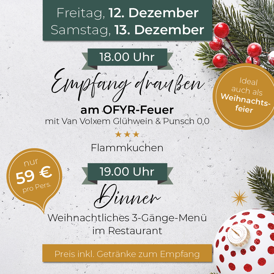 Wir starten draußen am OFYR-Feuer mit kleinen warmen Snacks, Van Volxem Glühwein & Punsch, bevor es drinnen mit einem winterlichen Menü weitergeht – gemütlich, stilvoll, winterlich🌲🤍
